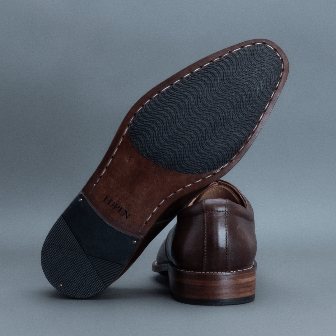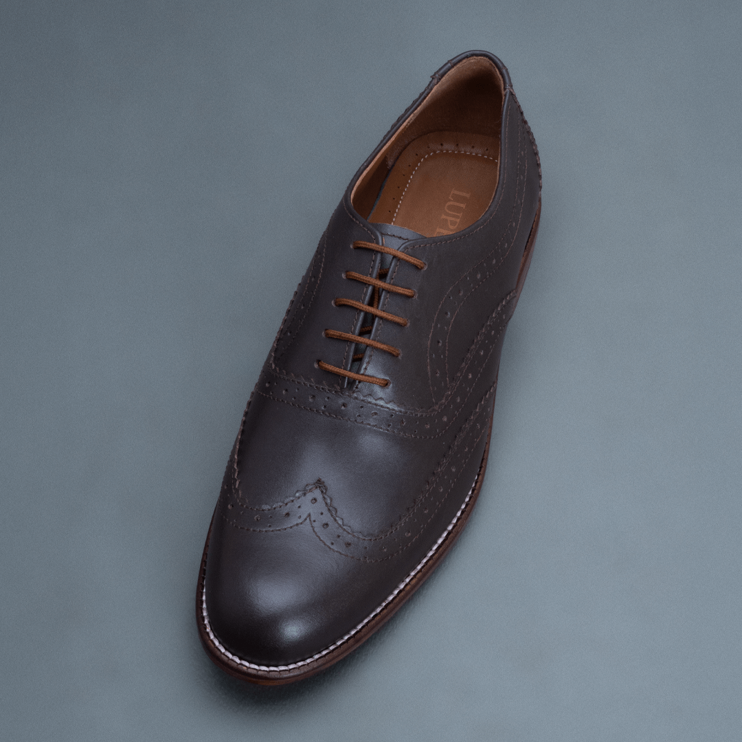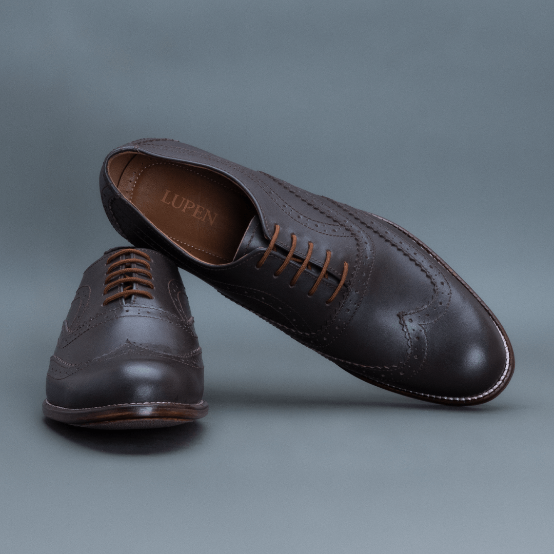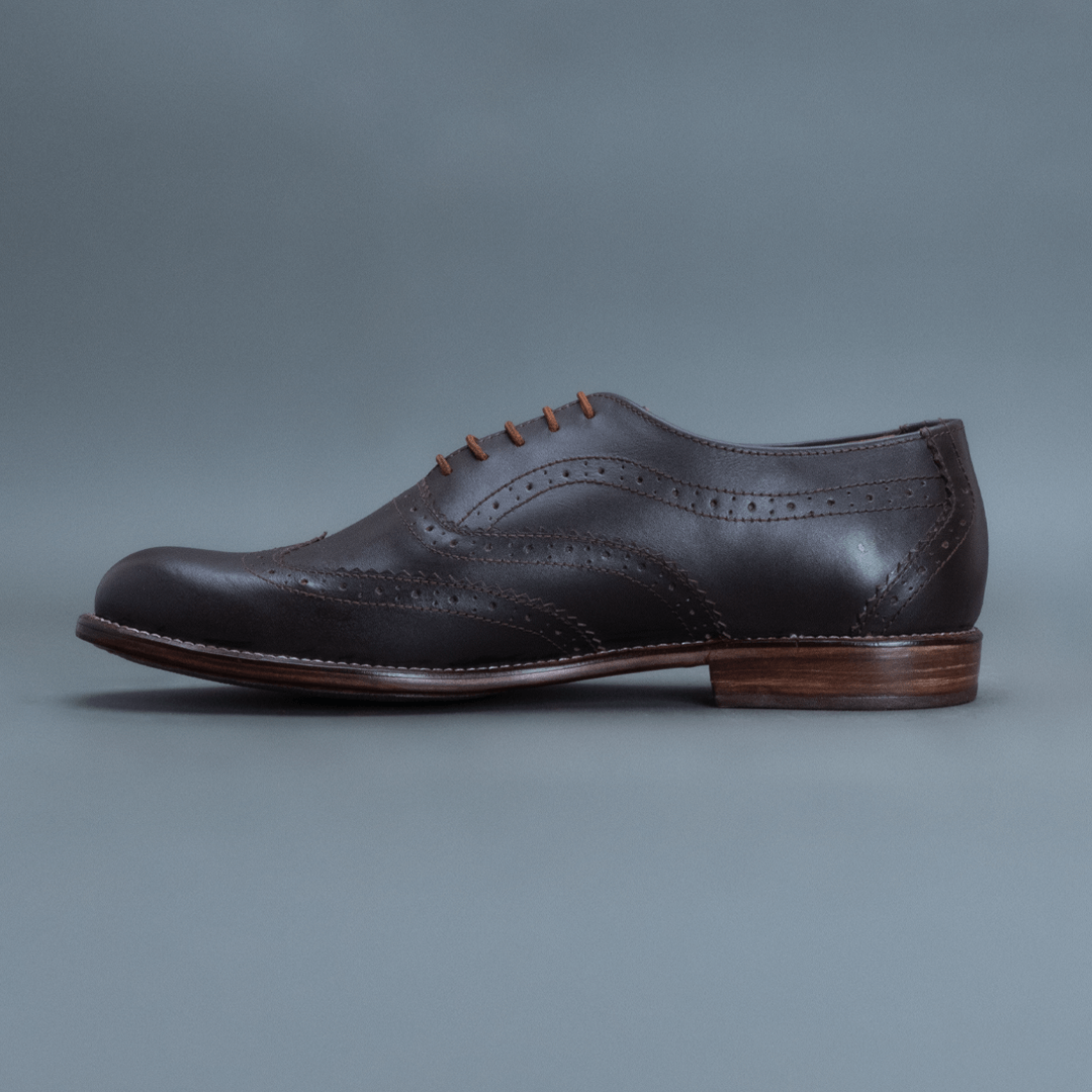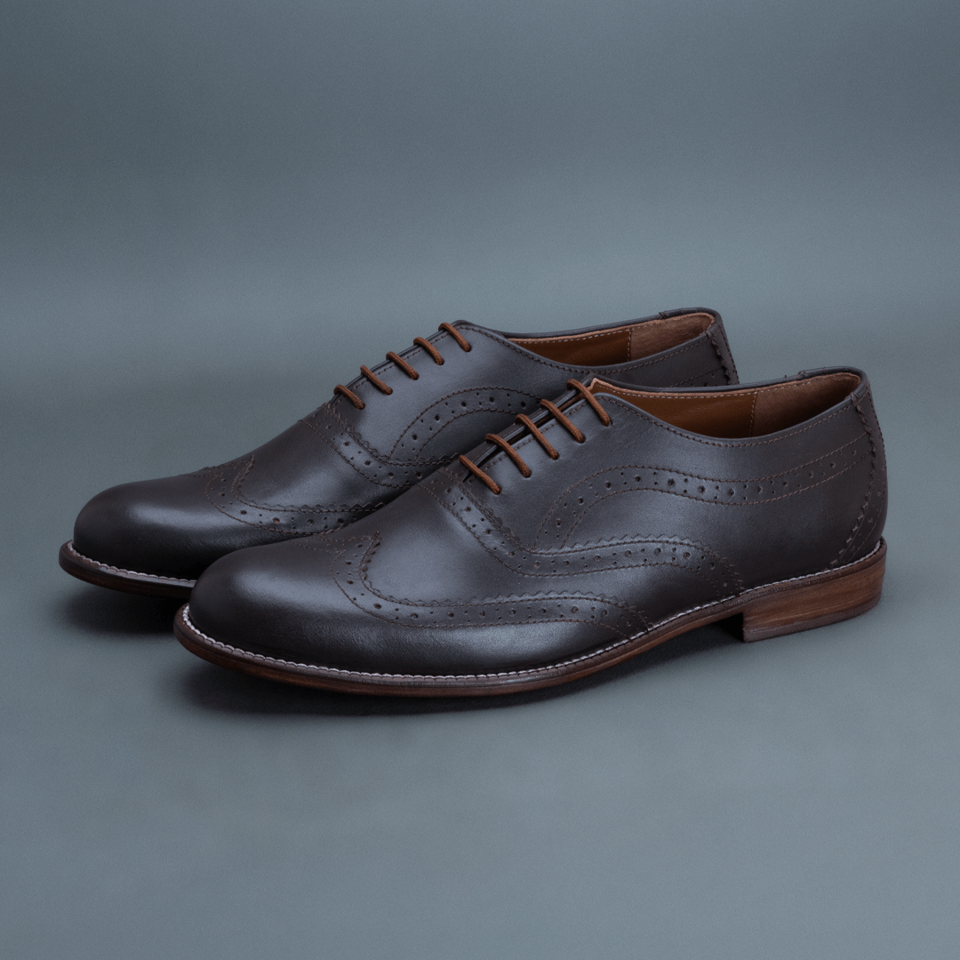 The Howl Wingtip Brogue Oxford – Dark Brown delivers a bold formal profile with pronounced brogue detailing. Crafted in full-grain leather, its dark brown finish enhances depth while the wingtip construction adds traditional character. The rounded toe maintains balance, keeping the design wearable for regular use.